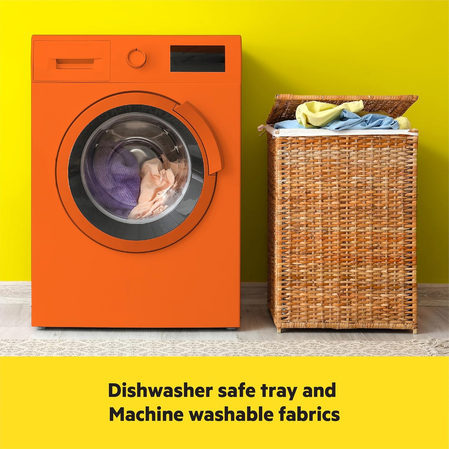 Compact chair easily folds to 5 x 15 inches; easy to clean with dishwasher safe tray and machine washable seat pad; includes a rear storage pocket for little essentials